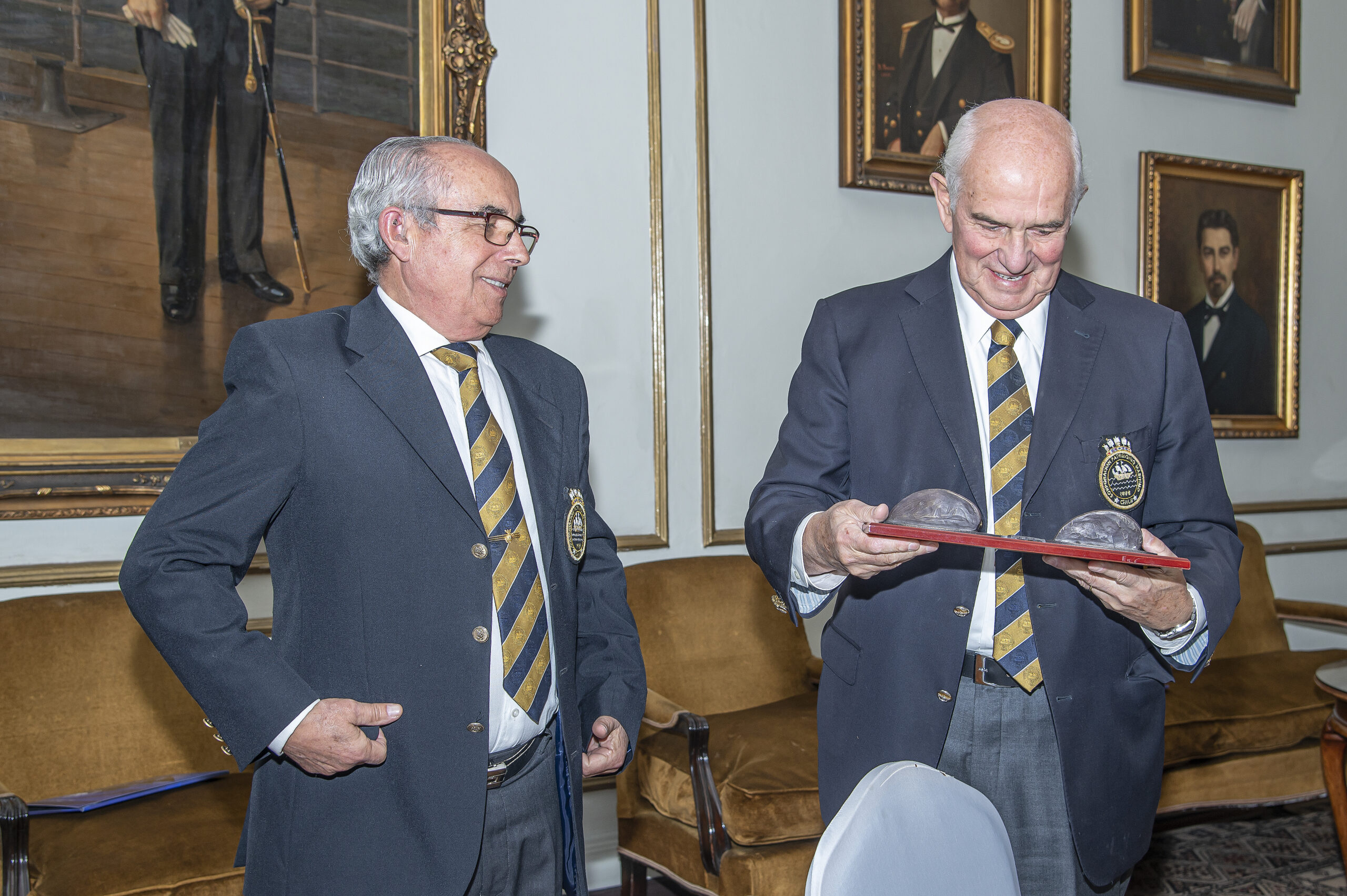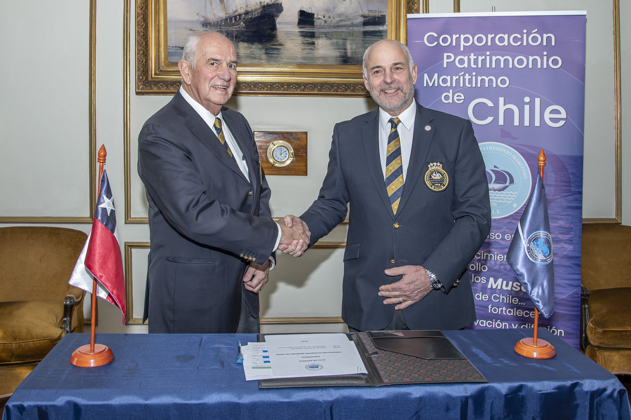 Al finalizar la reunión, el presidente saliente Almte. Rodolfo Codina Díaz y entrante, Almte. Juan Andrés de la Maza Larraín firmaron el acta de traspaso del cargo, para, luego dar paso a una actividad de camaradería para despedir al Almirante Codina tras 20 años en la presidencia de la Corporación Patrimonio Marítimo de Chile. En la oportunidad y tras 15 años formando parte del directorio de la corporación, se despidió también al director Sr. Luis Cambiaso Ropert.